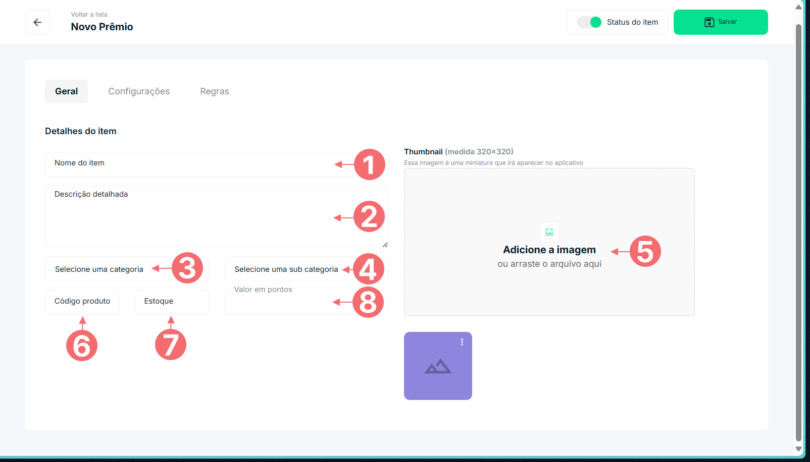- [5] Adicione a imagem: Clique ou arraste um arquivo de imagem para esta área. Esta será a foto de exibição (thumbnail) do prêmio no catálogo. A medida recomendada é 320×320 pixels.
