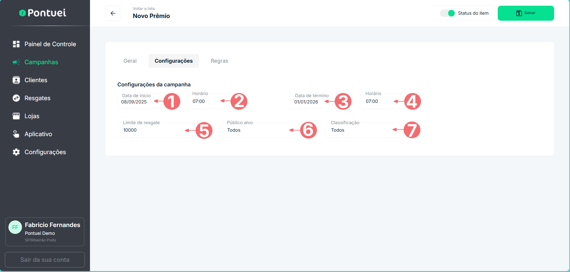 - [7] Classificação: Defina uma segmentação ainda mais específica para a campanha, baseada na classificação das lojas (ex: lojas da zona sul, lojas do estado Y). Isso permite que o prêmio seja visível apenas para um público-alvo em determinadas lojas.