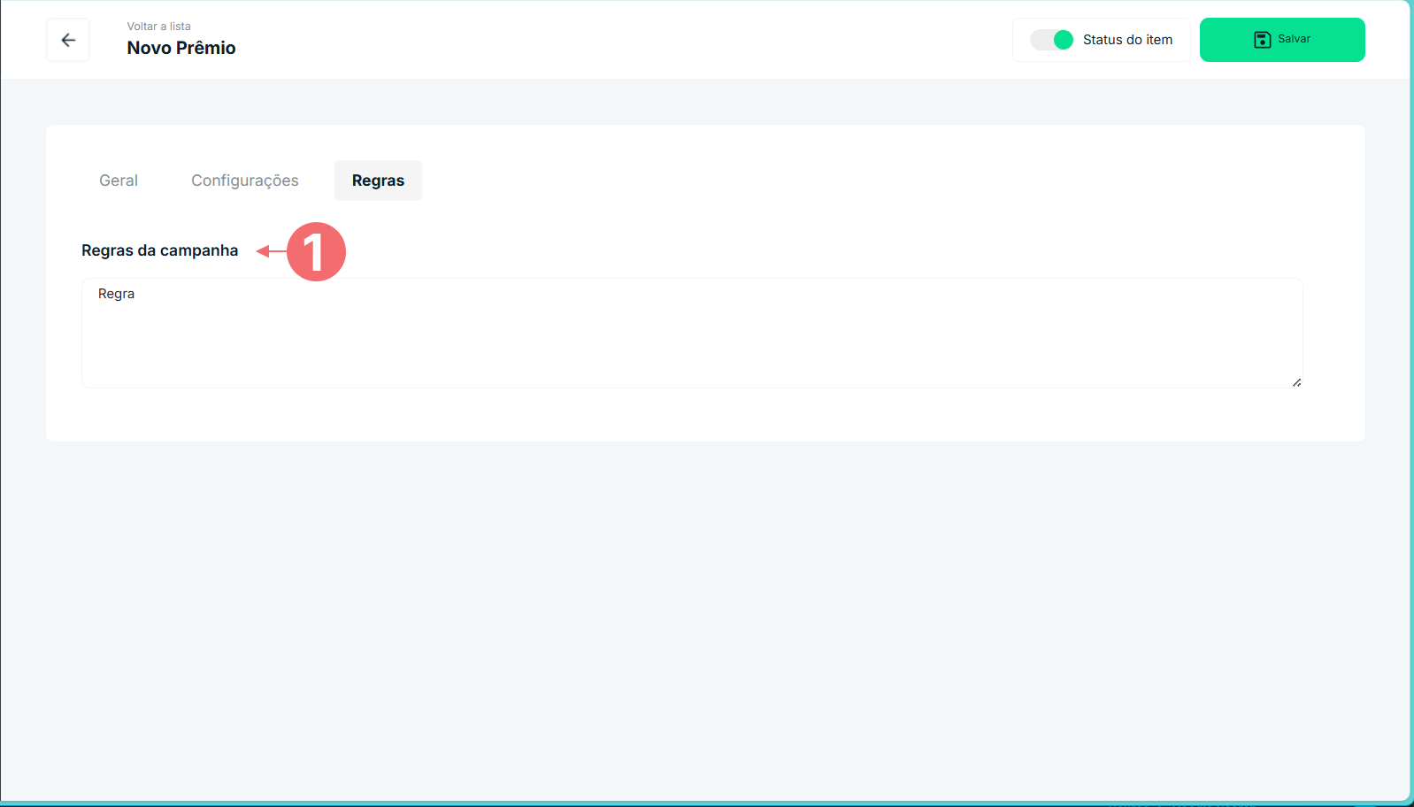 [1] Regras da campanha: Utilize este campo para detalhar todo o regulamento da campanha. É o local apropriado para incluir as cláusulas e condições mais burocráticas, garantindo que o usuário esteja ciente de todas as regras. Este texto pode ser padronizado e aplicado a diversos prêmios.
