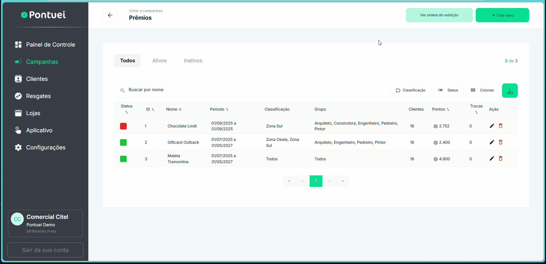 Caminho de acesso: Campanhas/Prêmios – campanha/premio