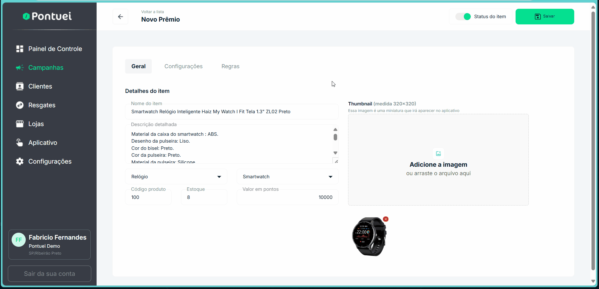 - [7] Estoque: Informe a quantidade de unidades deste prêmio que estão disponíveis para resgate.