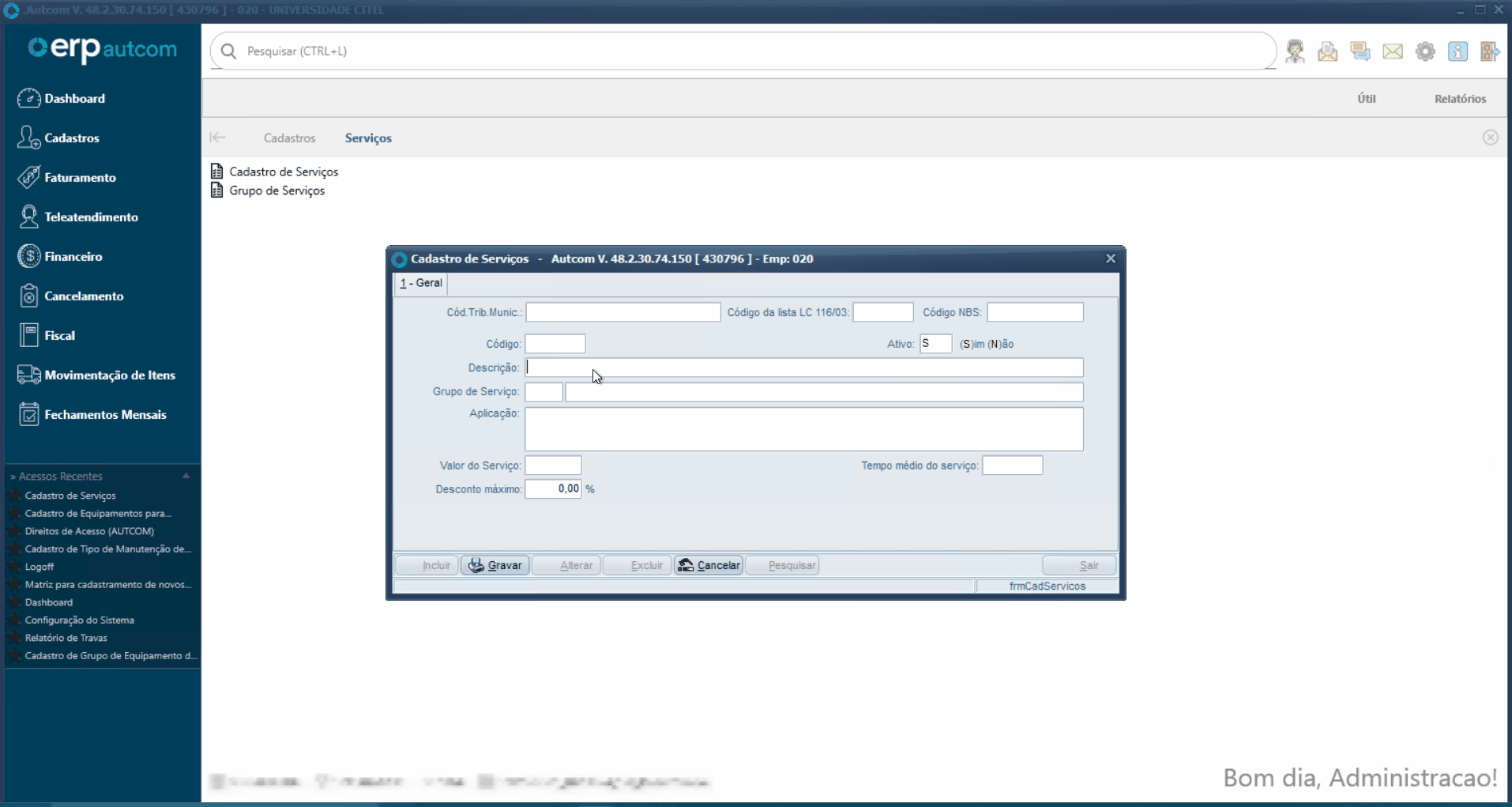 Para acessar o cadastro de serviços, é necessário que a configuração CFG_USASER – Utiliza serviços? esteja definida como Sim.