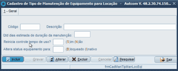 - Principal > Manutenção de Cadastros > Locação de Equipamentos > Cadastro de Tipo de Manutenção de Equipamento para Locação