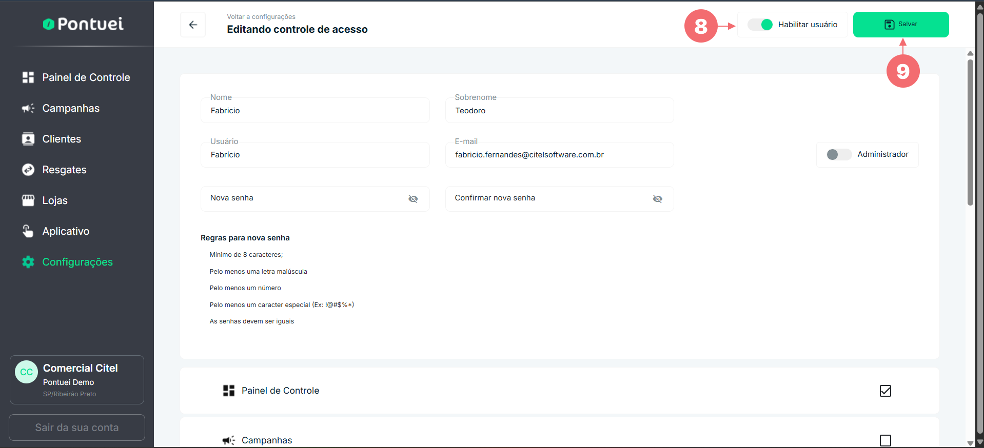 Para finalizar o cadastro, é preciso Habilitar usuário [8] e Salvar [9]: