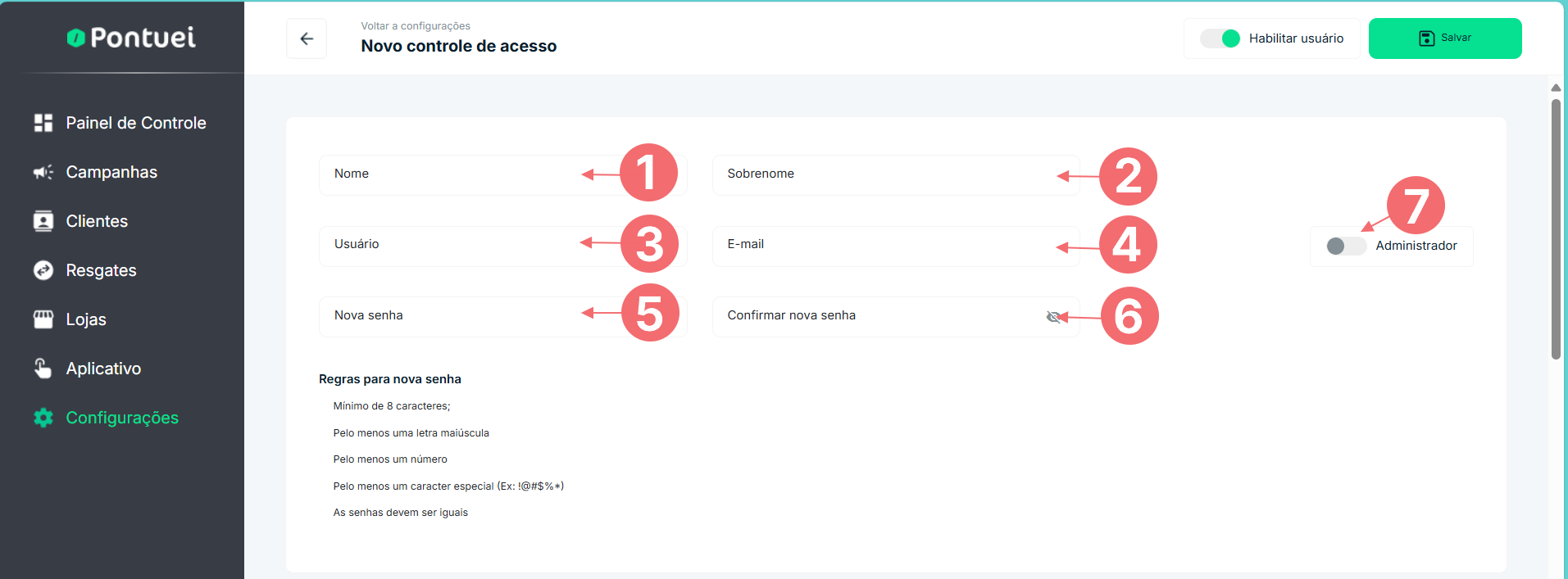 - [7] Administrador: Habilite esta opção caso o usuário a ser criado deva ter acesso total e permissão de administrador na plataforma.