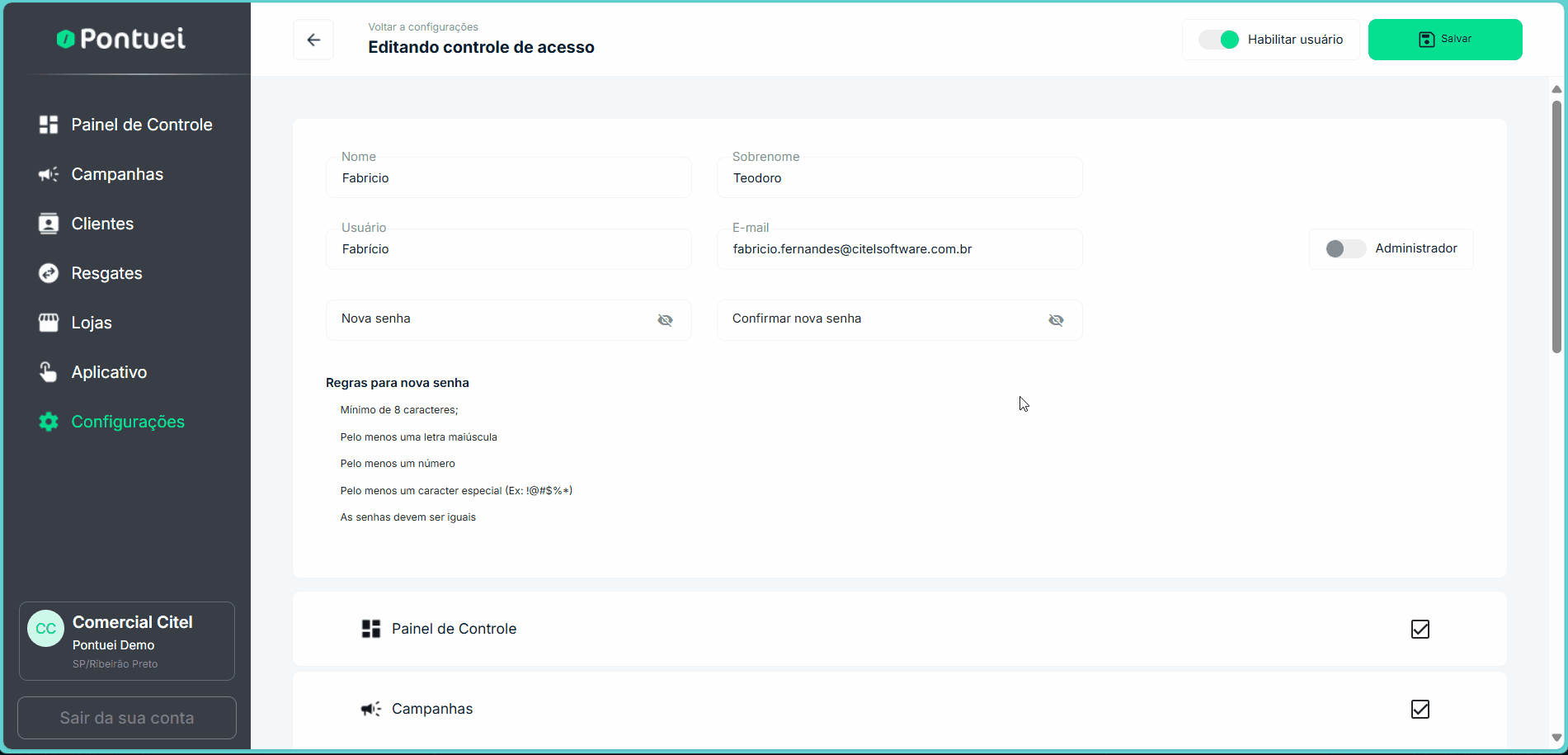 O administrador deve definir as permissões de acesso do novo usuário. Essas permissões controlam quais módulos do sistema o usuário poderá visualizar e gerenciar. A seguir, estão descritos os principais campos de configuração.