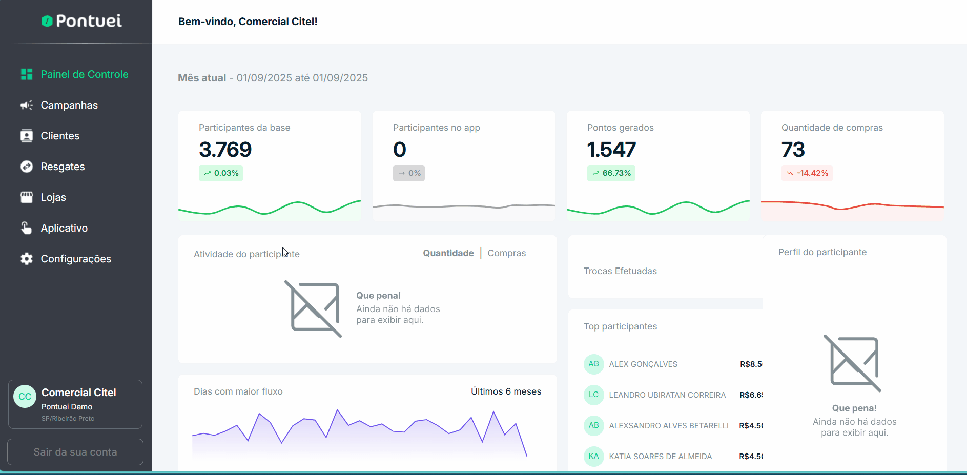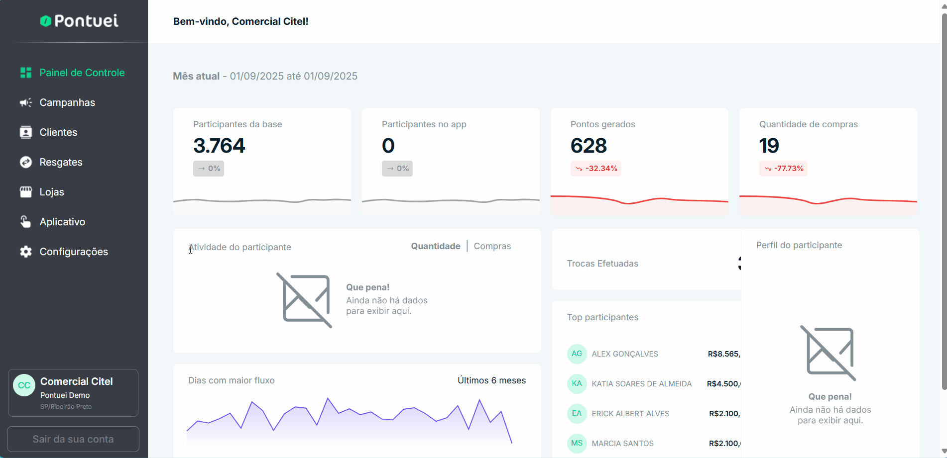 [1] Painel de Controle: Refere-se à permissão de acesso a um Dashboard que exibe informações gerais da plataforma, como “Participantes da base”, “Participantes no app”, “Pontos gerados”, “Quantidade de compras”, “Atividade do participante”, “Dias com maior fluxo”, “Trocas Efetuadas” e “Perfil do participante”.