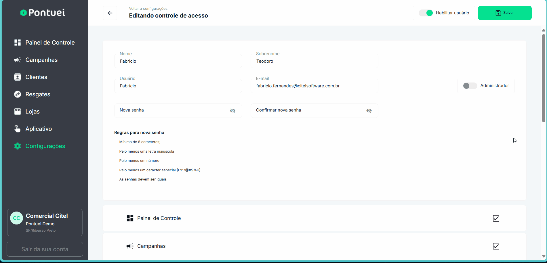 Para realizar a manutenção (alterar e excluir) do usuário de acesso, consulte a atividade Fazer manutenção no usuário de acesso Backoffice Pontuei.