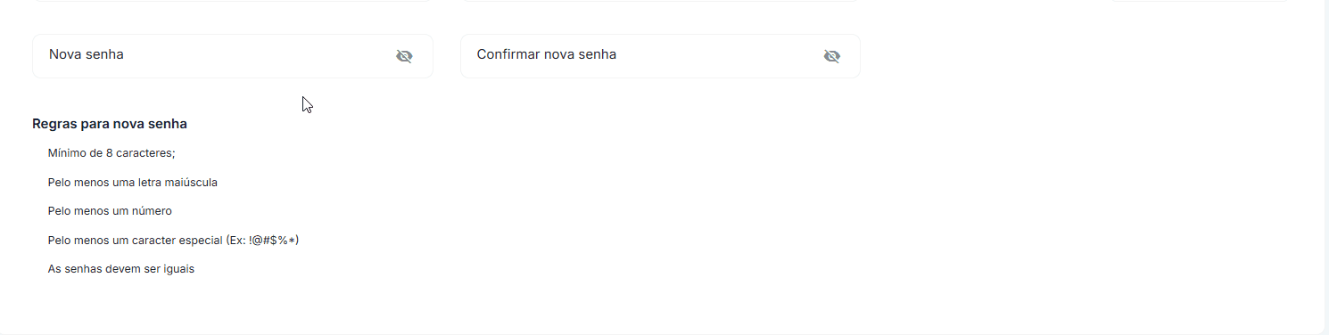 - As senhas devem ser iguais nos campos “Nova Senha” e “Confirmar Nova Senha”.