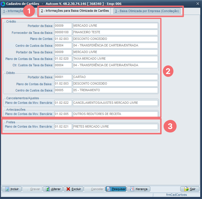 No cadastro desse cartão, é necessário preencher a aba Informações para Baixa Otimizada de Cartões [1] (ou Baixa Otimizada por Empresa – Conciliação), conforme os campos exibidos na tela [2], incluindo o Plano de Contas da Movimentação Bancária [3] destinado à contabilização do valor de frete: