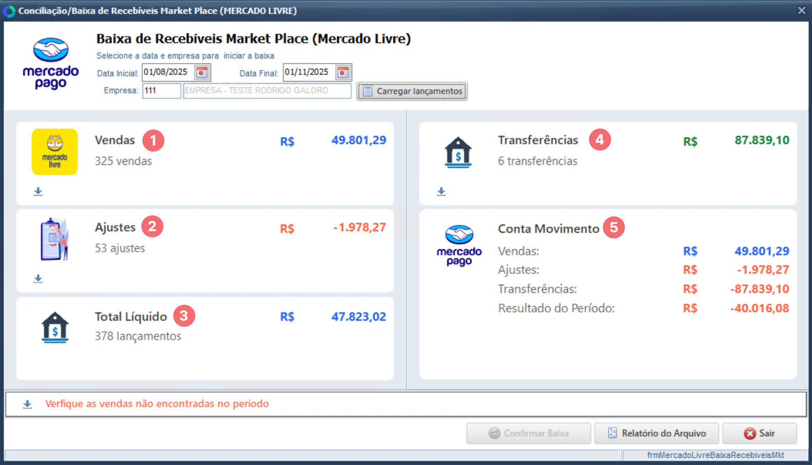 Dessa forma, o sistema mantém a rastreabilidade entre os valores conciliados, as transferências bancárias e o portador responsável pelos recebíveis do Mercado Livre.