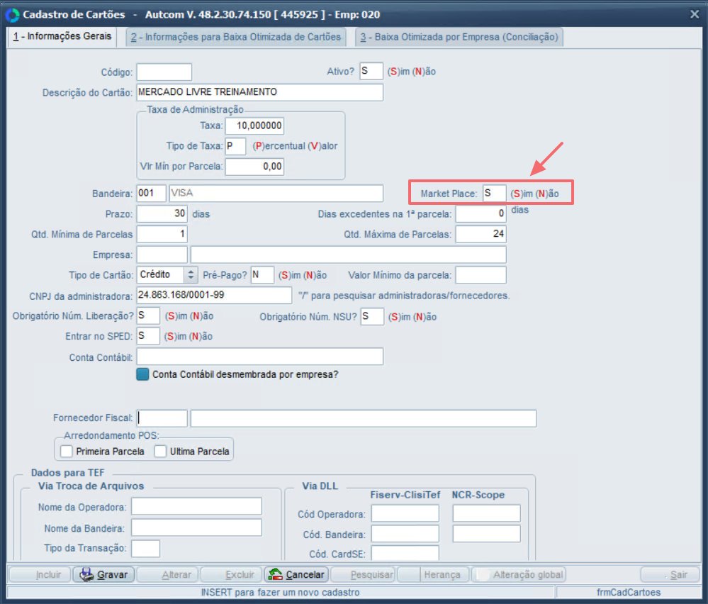 Para que os pedidos e pagamentos do Mercado Livre sejam registrados na Movimentação de Cartões, é necessário cadastrar um cartão exclusivo para o marketplace, marcando o campo Market Place, conforme mostra o Guia Visual abaixo: