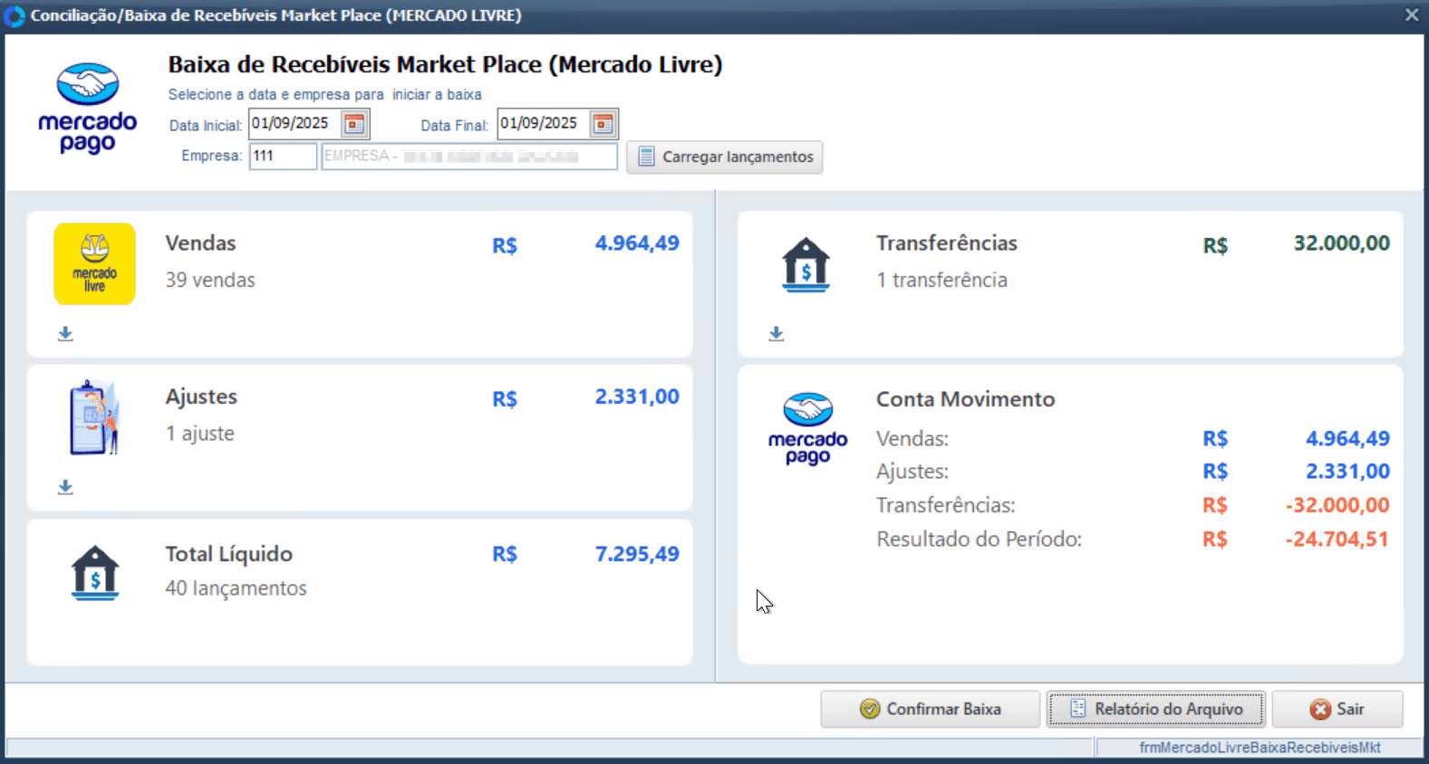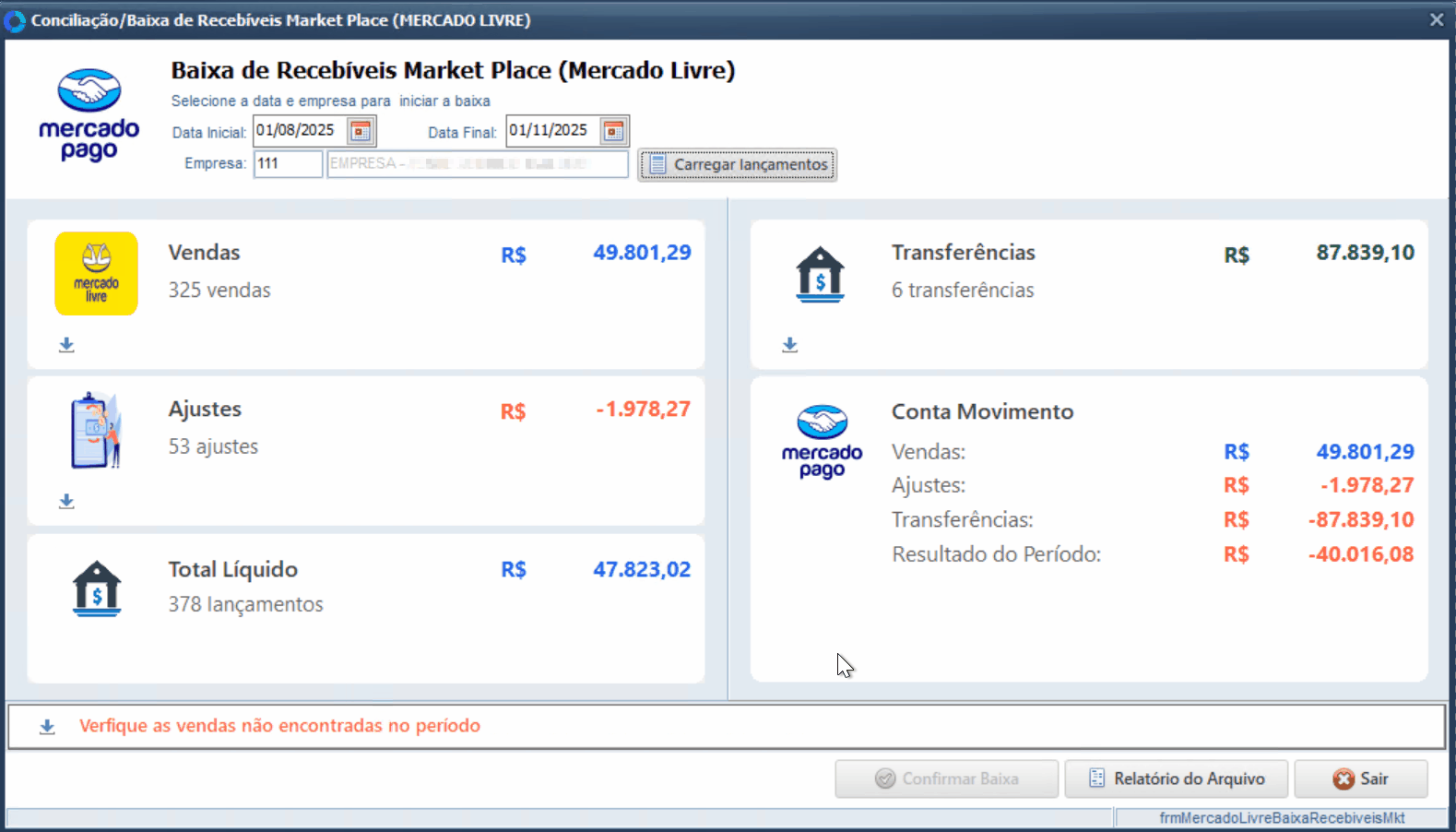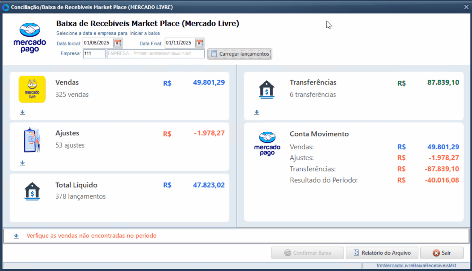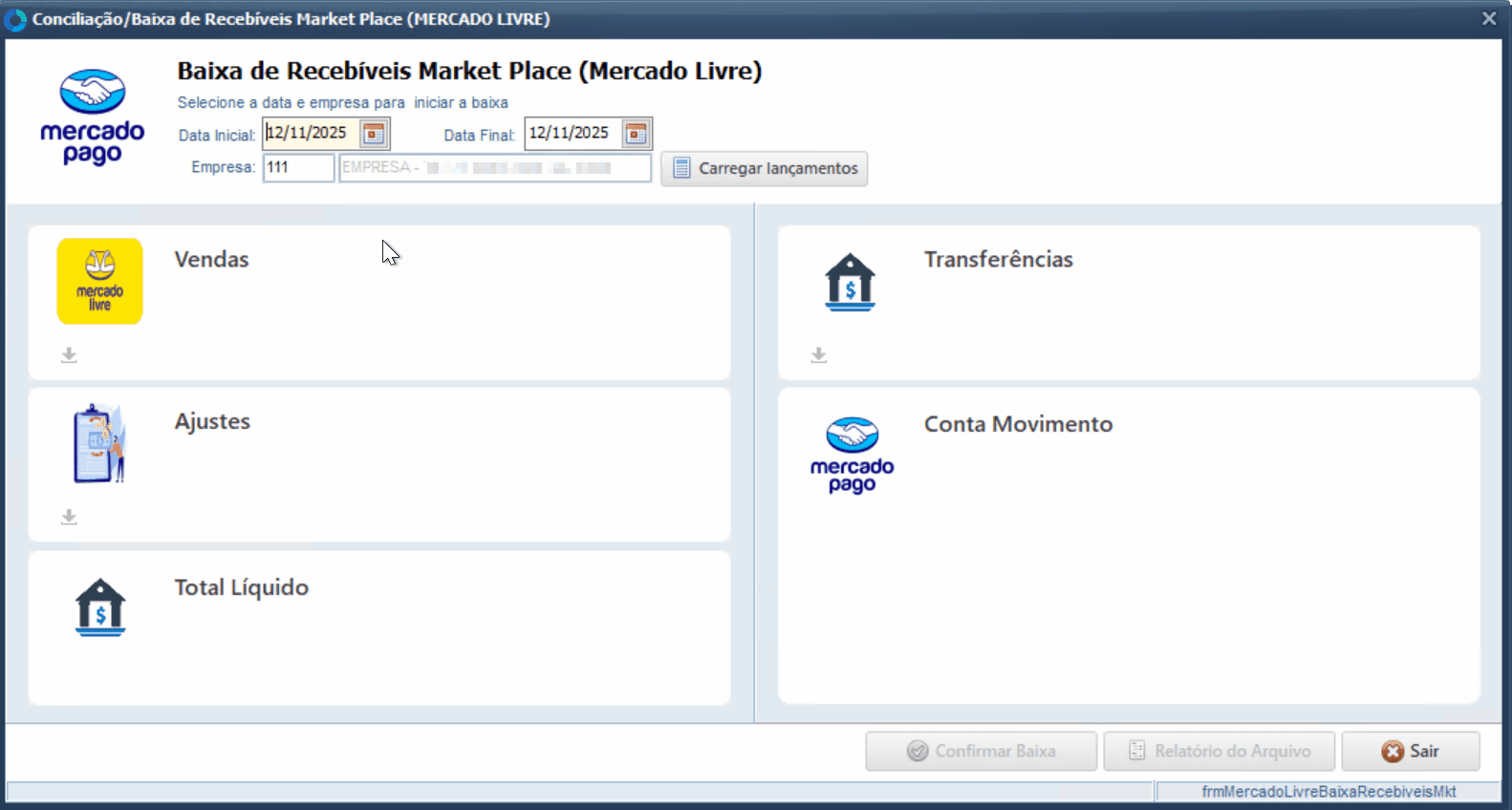 Após realizar os ajustes necessários, retorne à tela de Baixa de Recebíveis Mercado Livre.