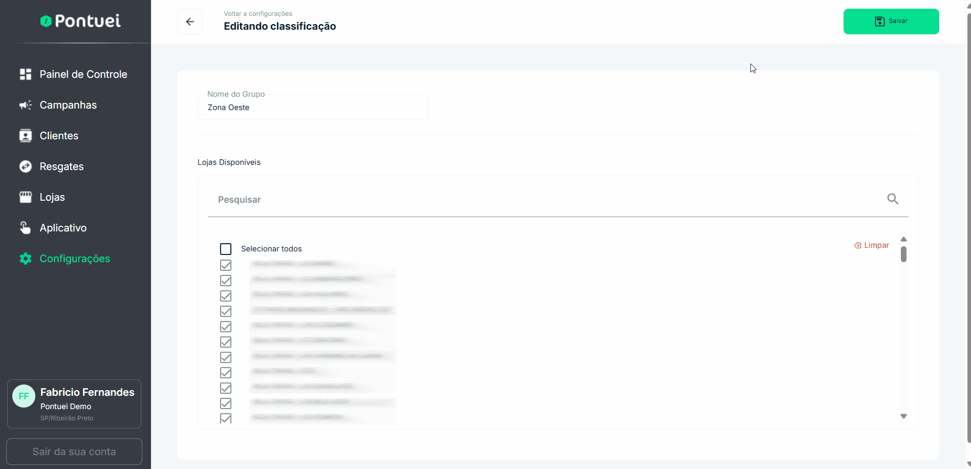 Fazer manutenção na classificação de lojas Backoffice Pontuei