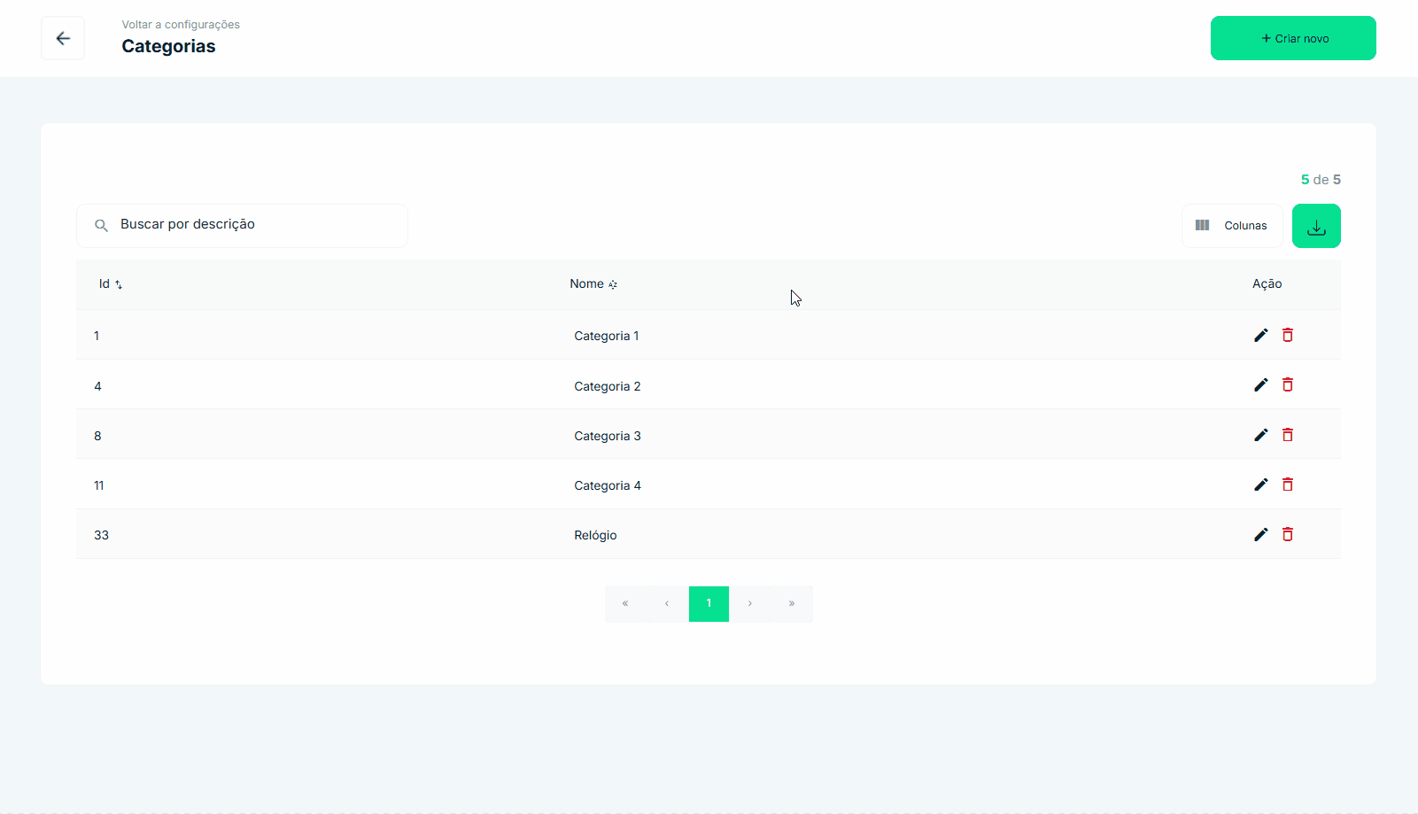 Na tela Categorias, clique na caixa de pesquisa Buscar por descrição e digite o nome da categoria que deseja alterar [1]. Os resultados correspondentes serão exibidos na lista. Para modificar ou remover uma categoria são usadas as ações