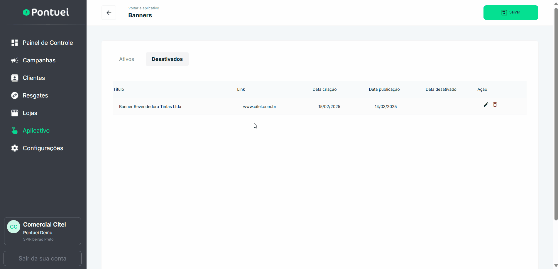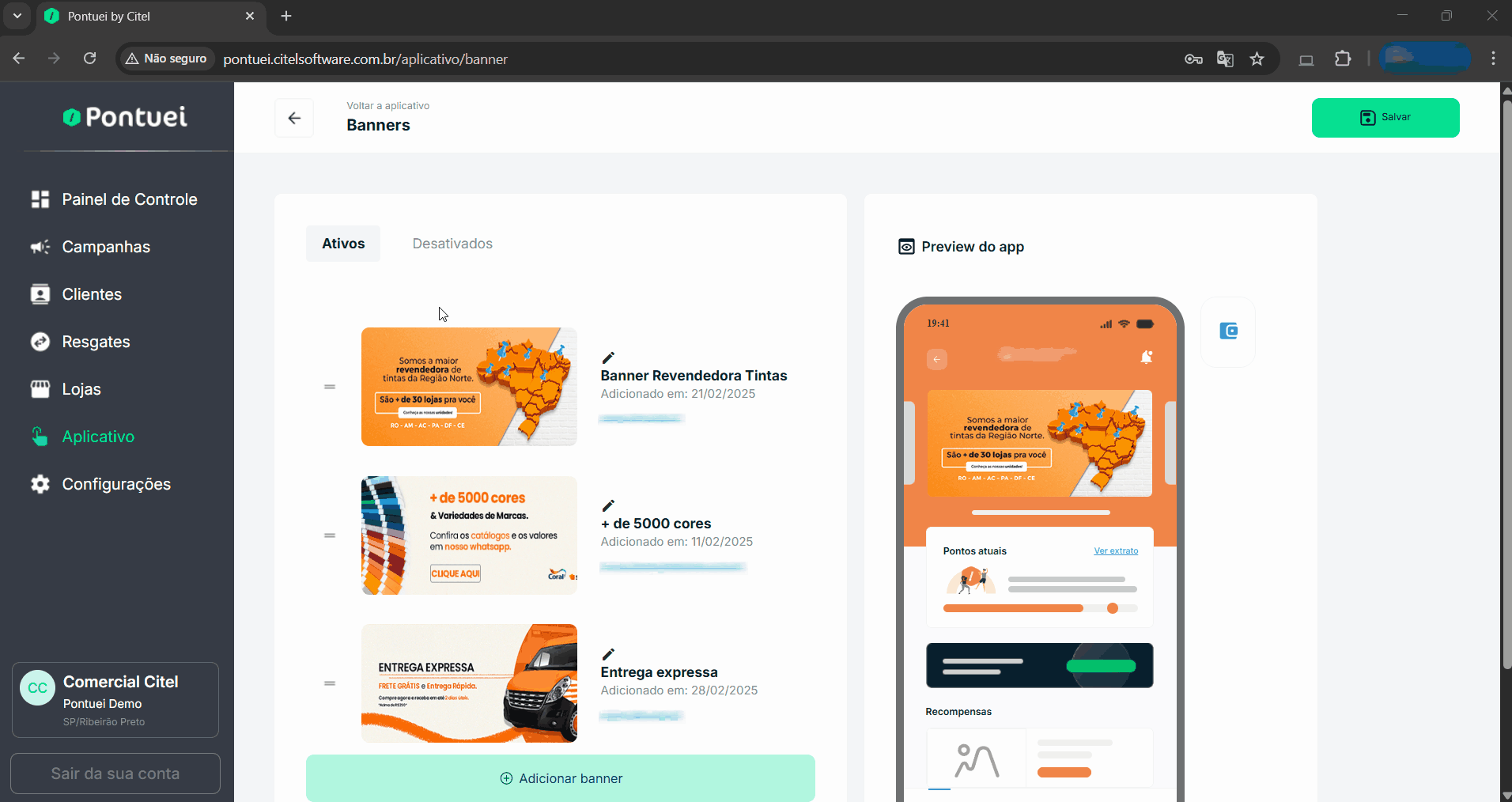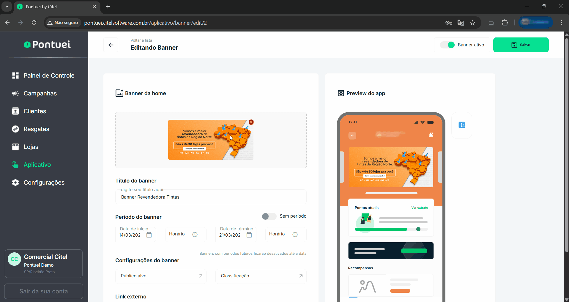 Para saber os detalhes do cadastro do banner promocional, consulte a atividade Cadastrar banner promocional do Pontuei.