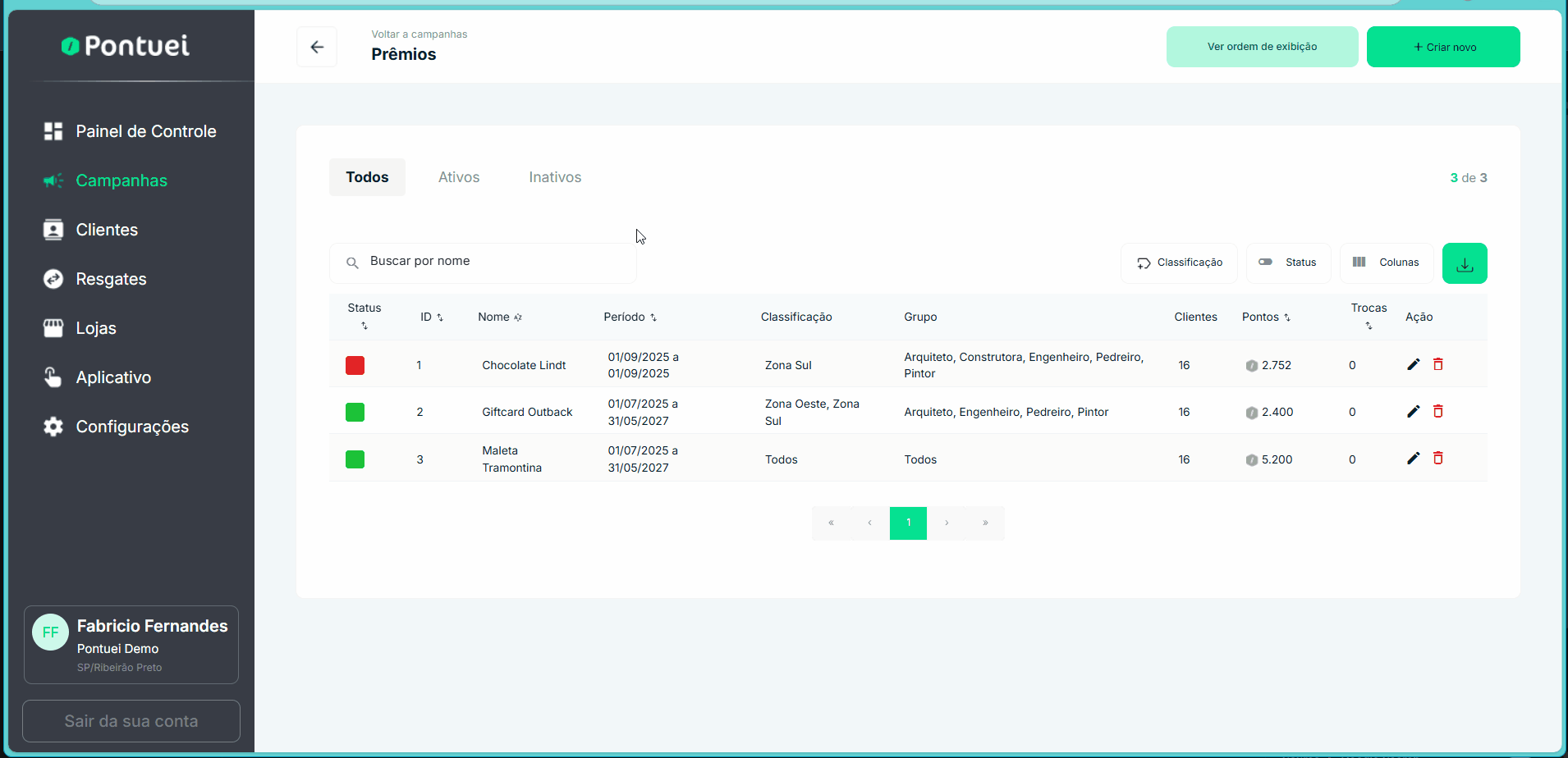 Caminho de acesso: Campanhas/Prêmios – campanha/premio
