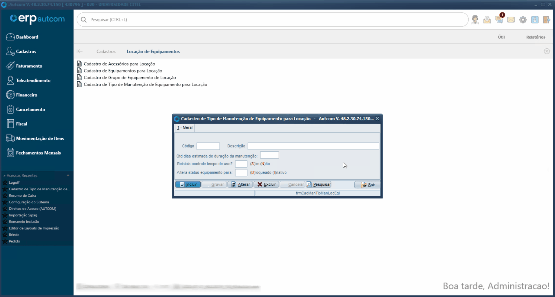• Principal > Manutenção de Cadastros > Locação de Equipamentos > Cadastro de Tipo de Manutenção de Equipamento para Locação
