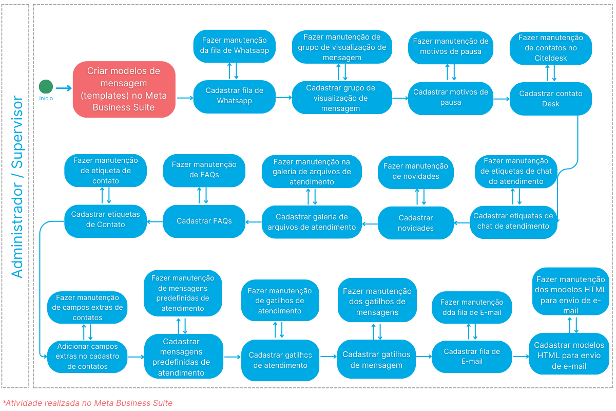O subprocesso Atendimento reúne as atividades de configuração e manutenção necessárias para o funcionamento das rotinas de atendimento no Desk. Ele contempla desde a criação e gestão de filas de atendimento até a configuração de mensagens, contatos e demais informações utilizadas no suporte ao cliente.