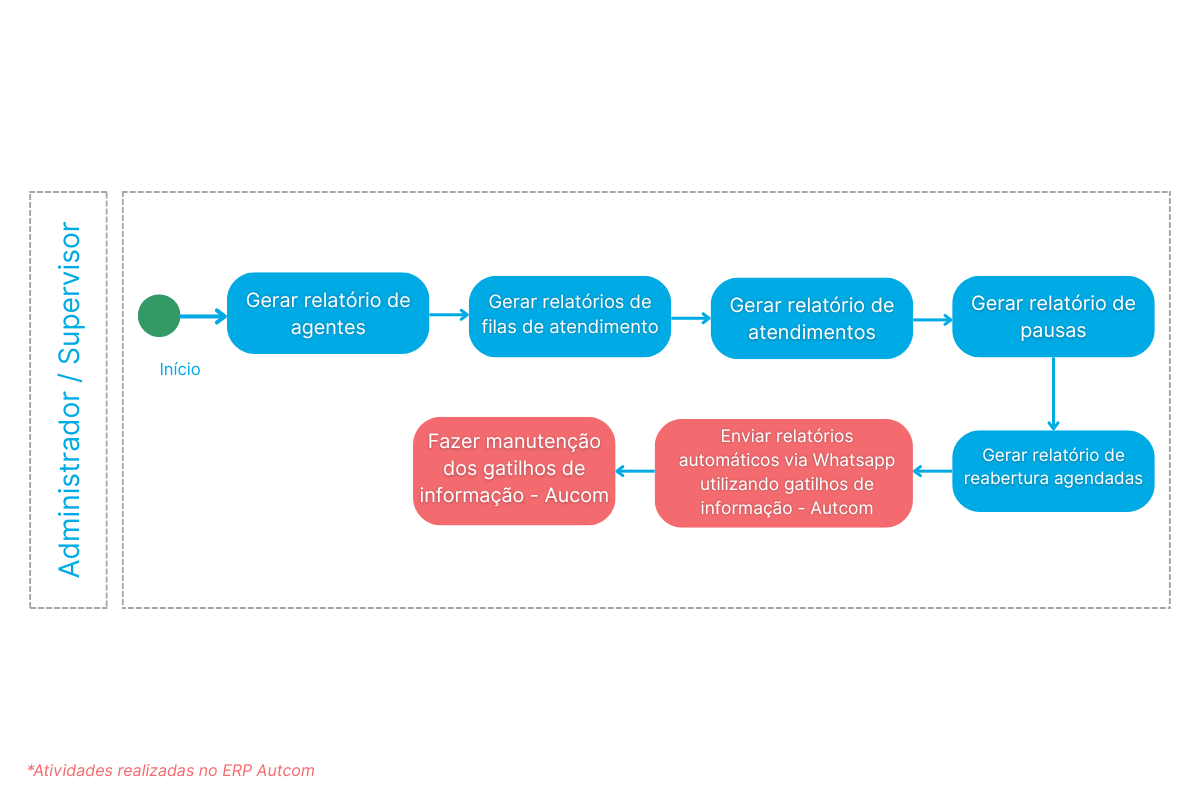 Nesta seção, você encontrará orientações sobre a geração e análise de relatórios do Desk, como relatórios de agentes, filas, pausas e reaberturas, além da configuração de gatilhos de informação integrados ao ERP Autcom para envio automático de relatórios via WhatsApp. Esses gatilhos permitem automatizar o envio de informações aos gestores conforme regras definidas, como periodicidade, tipo de relatório e destinatários.