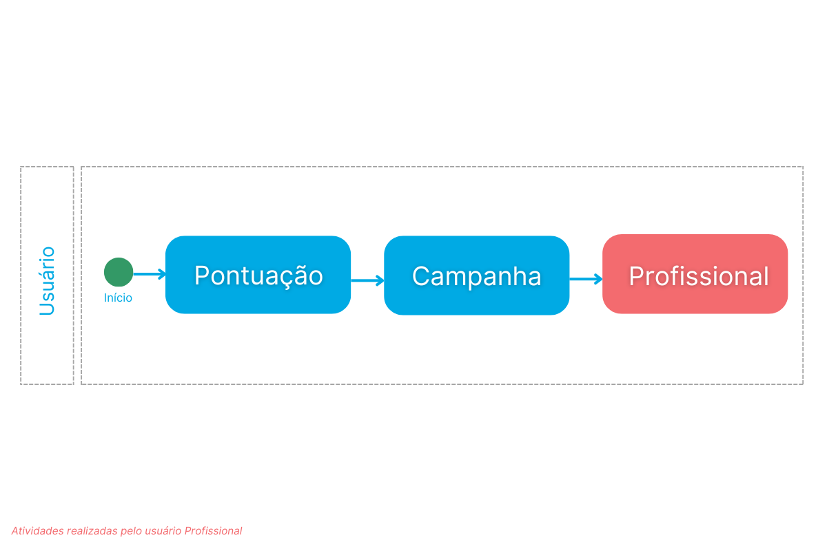 Por fim, no processo Profissionais, o profissional parceiro utiliza o app Pontuei para acessar sua carteira de lojas, acompanhar o extrato de pontos acumulados, consultar prêmios disponíveis e obter informações práticas das lojas parceiras.
