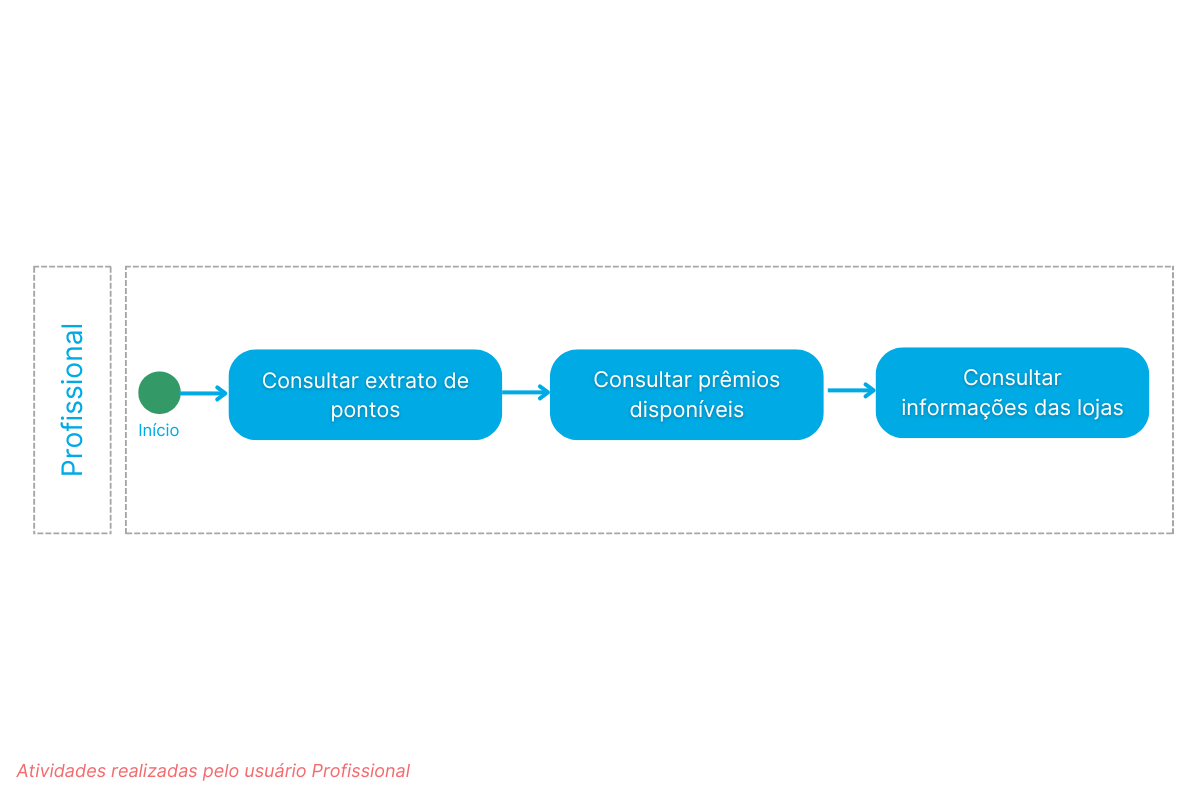 O subprocesso Operação concentra as funcionalidades de uso contínuo do app, como consultar o extrato de pontos acumulados, visualizar os prêmios disponíveis para resgate e acessar informações gerais das lojas parceiras.