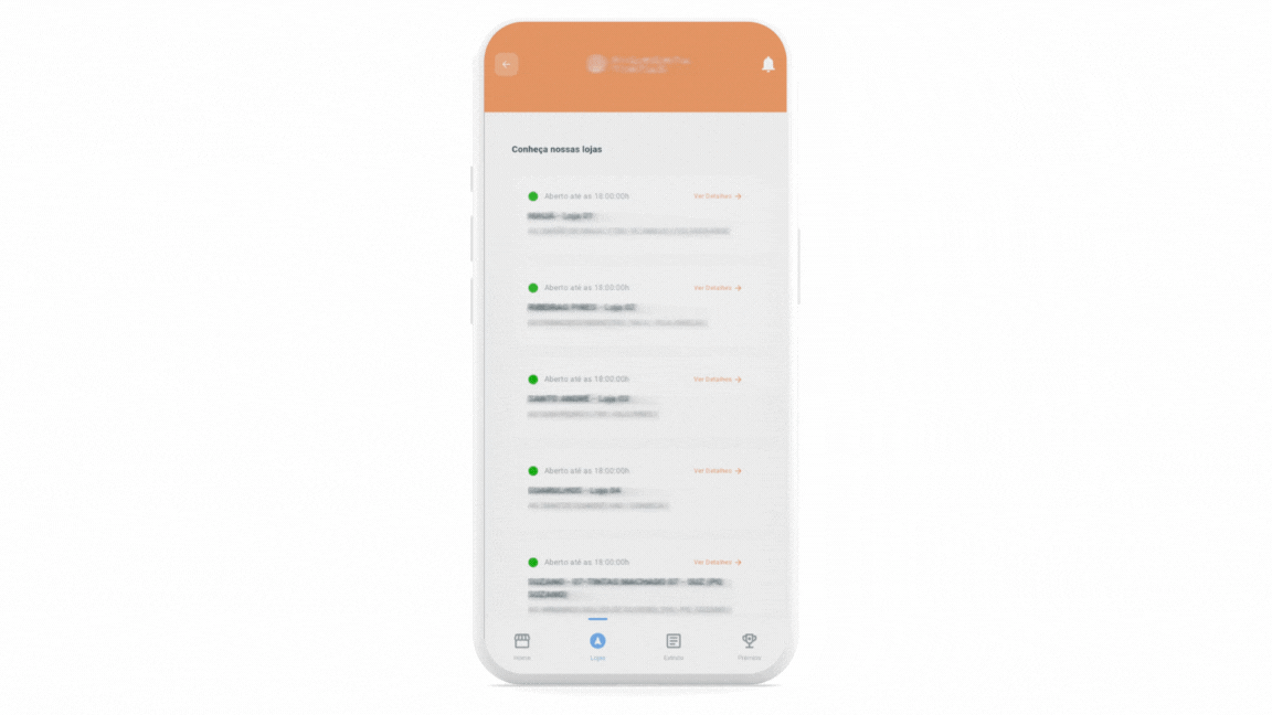 O aplicativo exibe a lista das lojas ativas [1] na carteira selecionada. Para visualizar todas as lojas, deslize o dedo para cima [2]. Logo na lista já é possível verificar as lojas abertas e fechadas no momento da consulta, além do seu endereço e telefone: