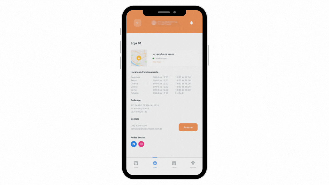 A localização permite abrir o aplicativo de mapas do celular para traçar a rota até a loja. Para isso, basta tocar sobre o mapa exibido: